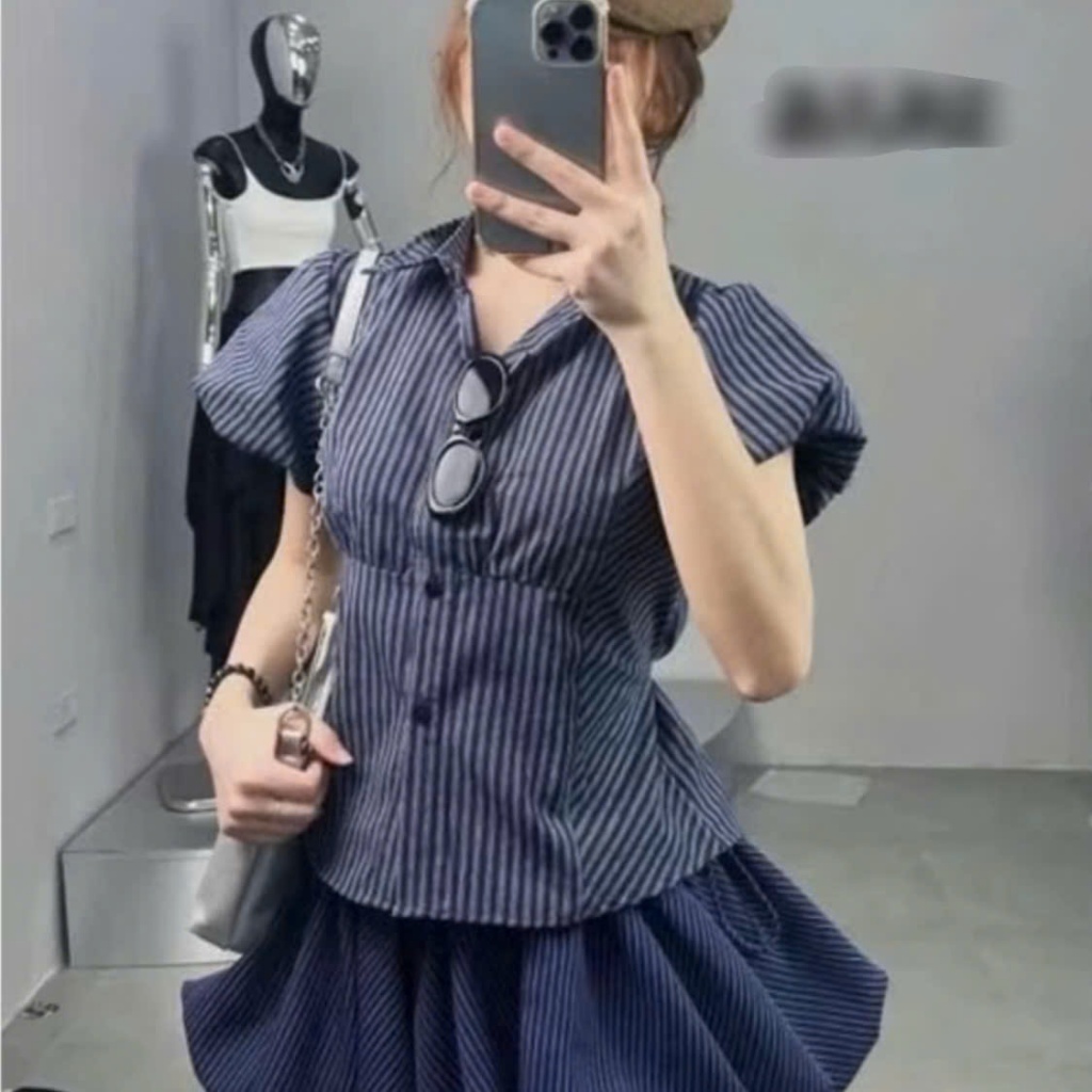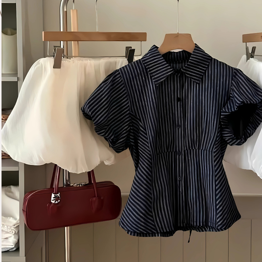 Áo Sơ Mi Nữ Hàn Quốc Kẻ Sọc Tay Bồng Chiết Eo Ôm Dáng Thanh Lịch