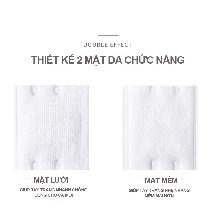 - 1 Túi có 222 miếng. Bông có 2 mặt tiện lợi 1 mặt sần và một mặt mịn đã chức năng giúp tẩy trang nhanh chóng