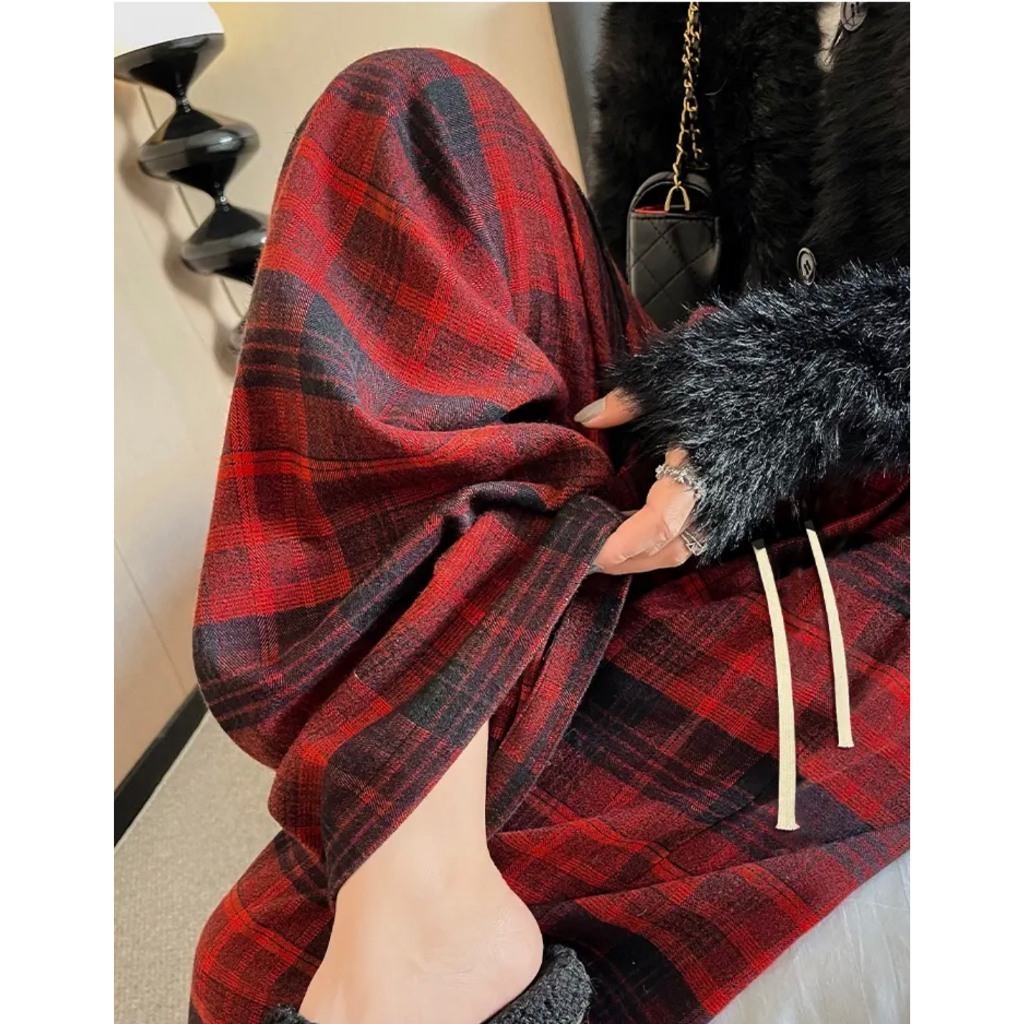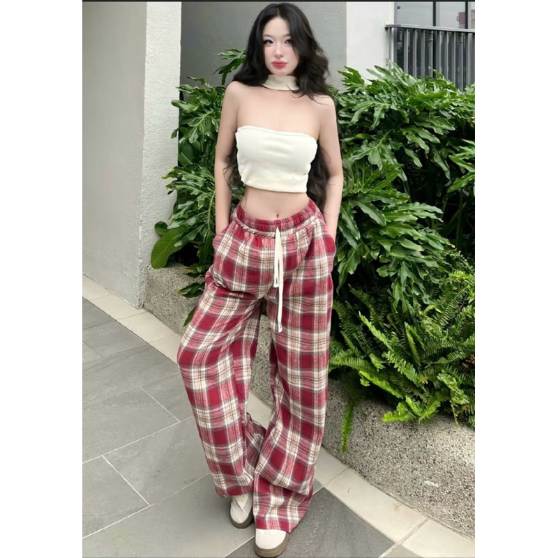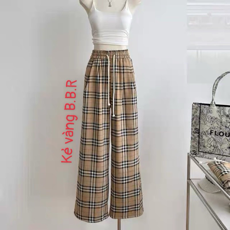 Quần ống rộng kẻ sọc , quần ống suông lưng cao cạp chun màu đen vải xốp nhăn họa tiết đi chơi đi học hot trend